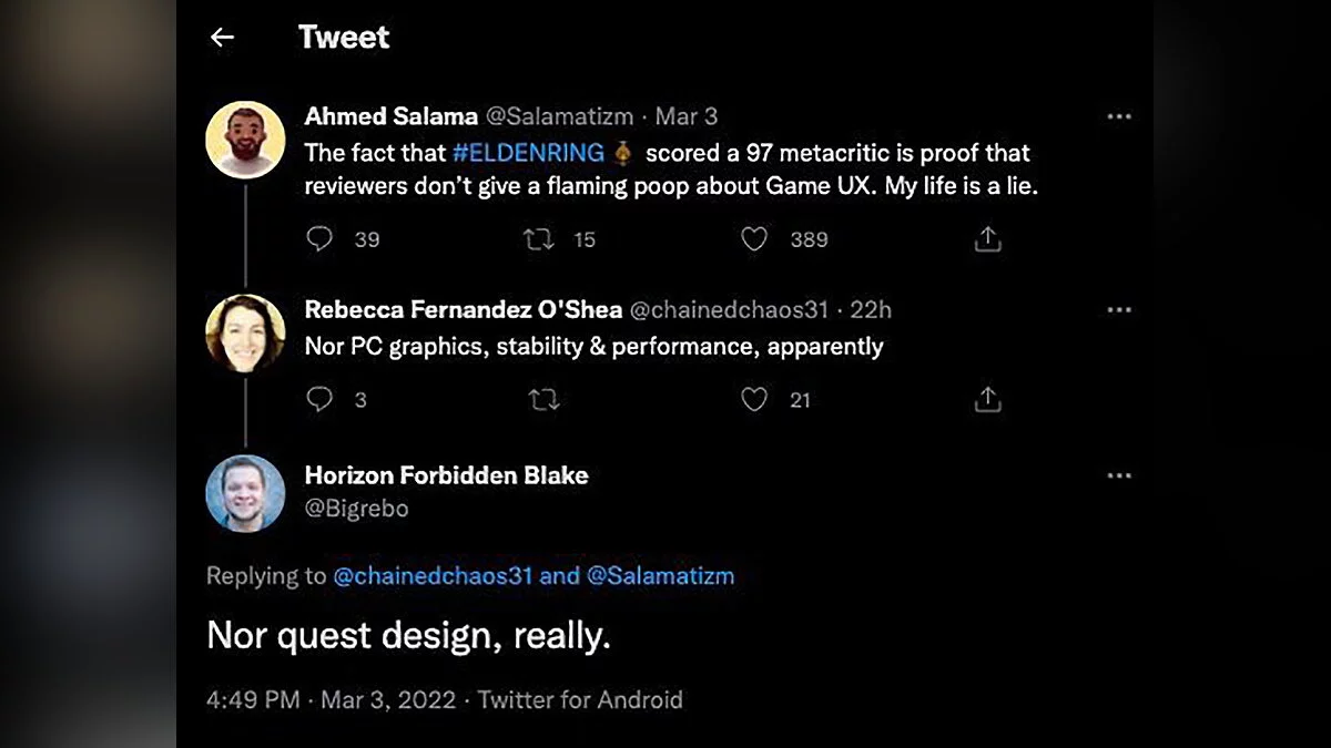 UX-дизайнер из Ubisoft Ахмед Салама (Ahmed Salama) заявил в Twitter, что высокая оценка на Metacritic (97/100 баллов) — доказательство того, что критикам «плевать на игровой UX». К тем подключилась Ребекка Фернандес О'Ши (Rebecca Fernandez O'Shea) из студии Nixxes Software, которой владеет Sony. Она добавила, что авторов обзоров также не интересуют ни графика, ни стабильность, ни производительность. Блейк Ребуш, дизайнер квестов Horizon Forbidden West, отметил, что критиков не волнует и дизайн квестов.
