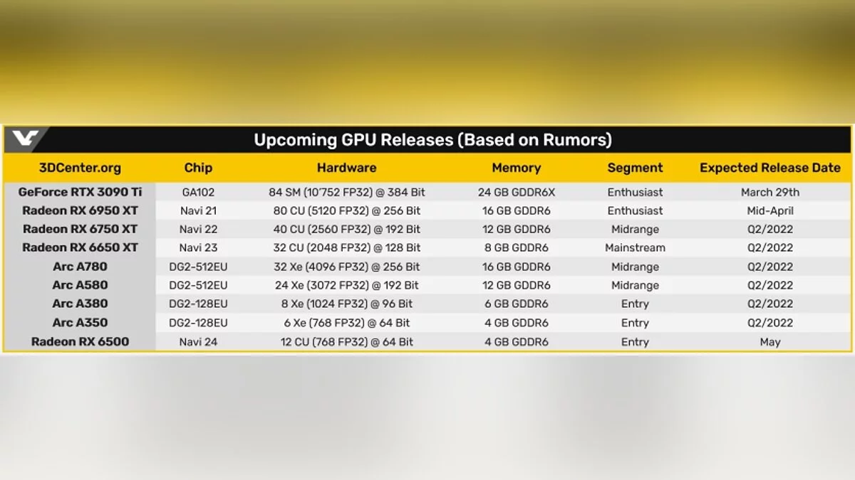 Младшие версии Arc A350 и A380 (DG2-128EU) будут конкурировать с Radeon RX 6500 и GeForce RTX 3050. Также ожидается версия A580 со 192-битной шиной и 12 ГБ видеопамяти.