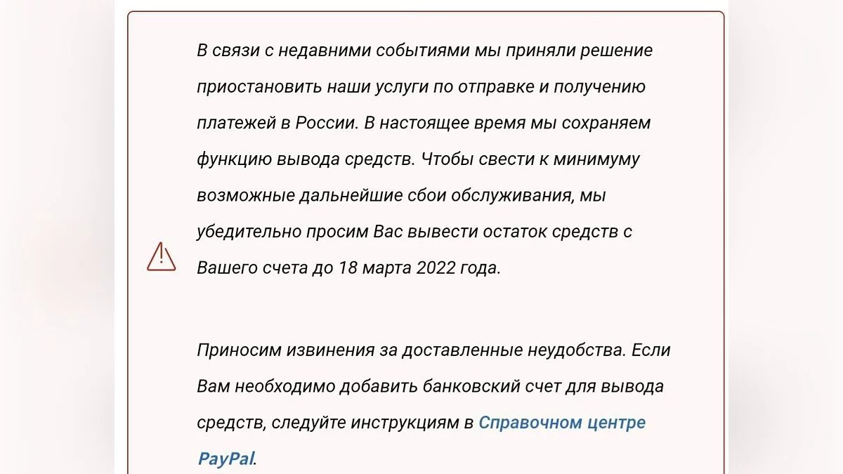 Сервис PayPal готовится полностью закрыть российские кошельки. Там разослали пользователям письмо, в котором сообщили дату закрытия.