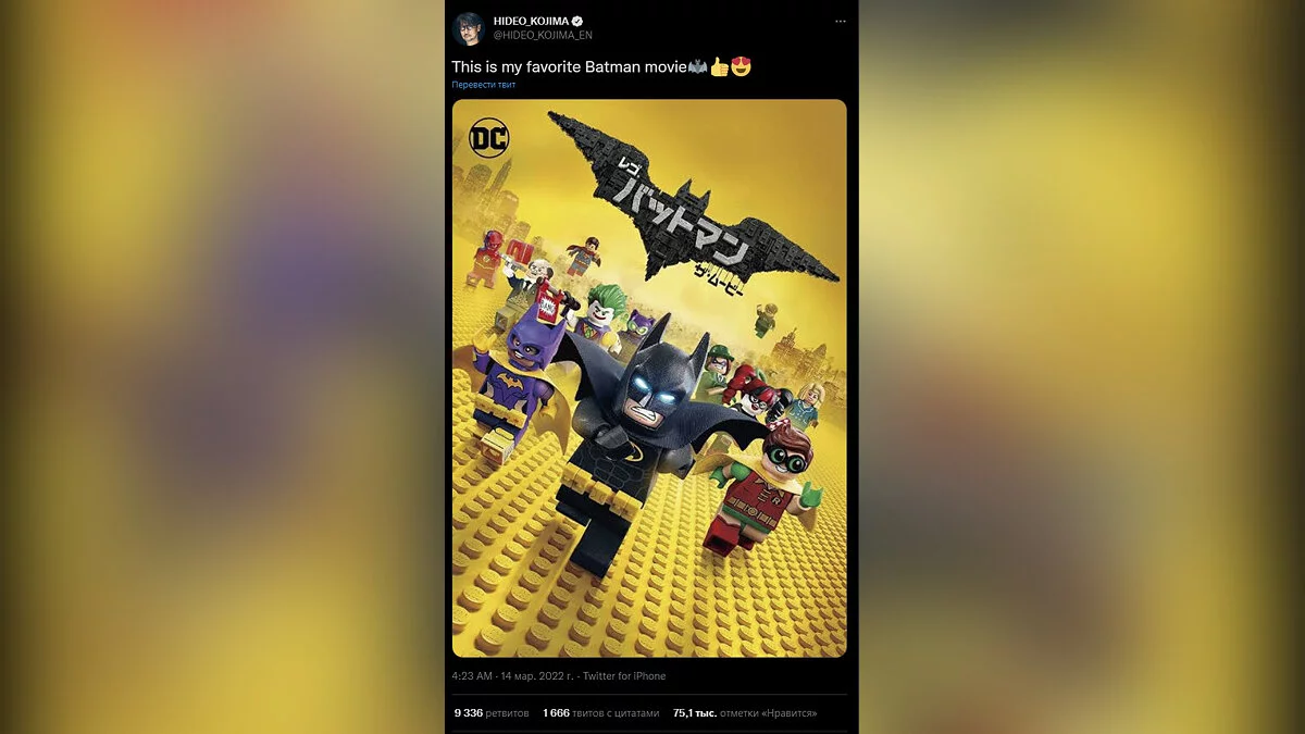 По словам Кодзимы, больше всего он любит комедийный мультфильм «Лего Фильм: Бэтмен» 2017 года, где знаменитый борец с преступностью не только спасает Готэм, но и прорабатывает свои страхи.