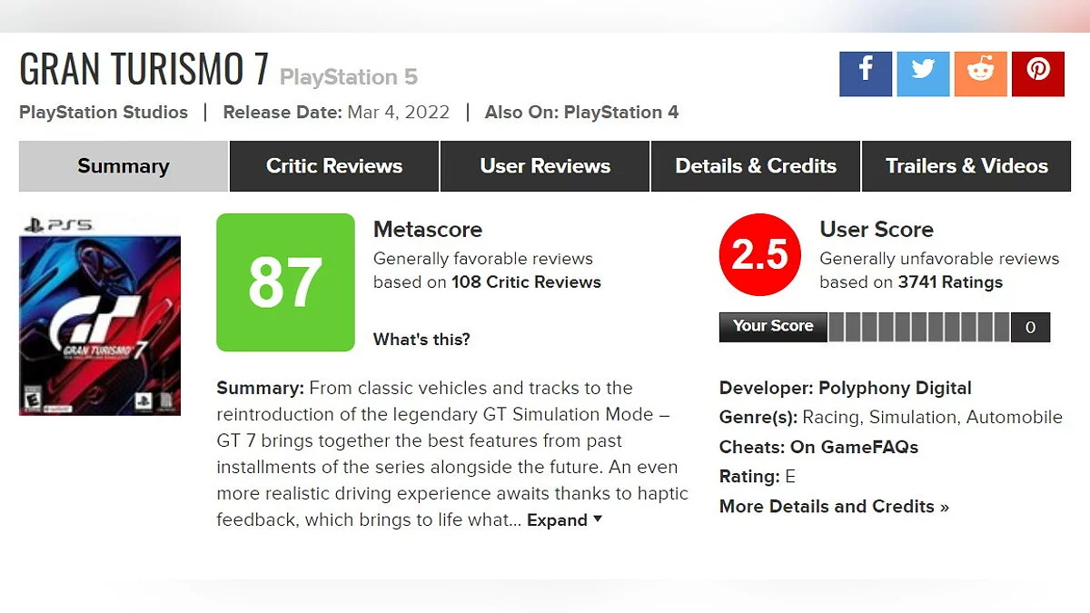 Gran Turismo 7 получила на Metacritic самую низкую оценку игроков среди всех проектов Sony. На момент публикации новости PS5-версия имеет 2,5/10 баллов.