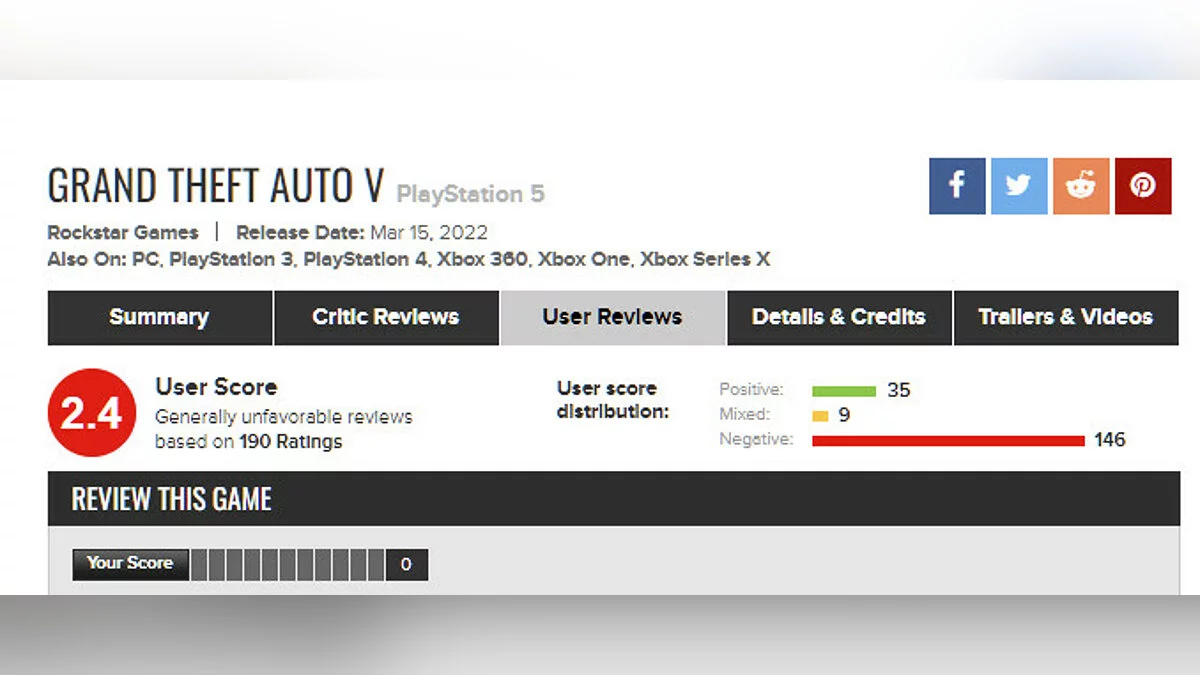 Вышедшая 15 марта некстген-версия Grand Theft Auto 5 «утонула» в негативных оценках на Metacritic. Сейчас версии для PS5 и Xbox Series X/S имеют чуть больше двух баллов: пользователи недовольны, что под видом большого переиздания им предлагают купить простой патч.