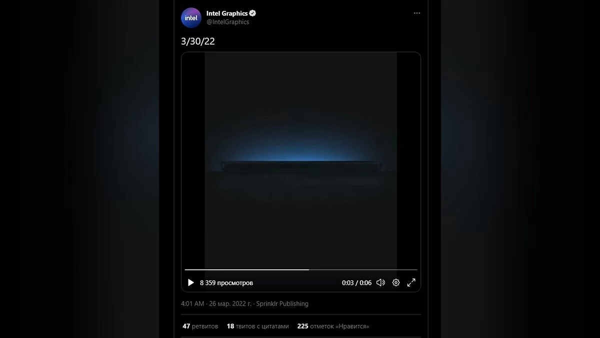 Компания Intel подтвердила скорый анонс графических чипов Arc A300M для ноутбуков. В Twitter появился тизер, который подтверждает дату 30 марта в качестве дня анонса. Как ожидается, в этот день компания покажет графические процессоры A350M и A370M для маломощных и тонких ноутбуков.