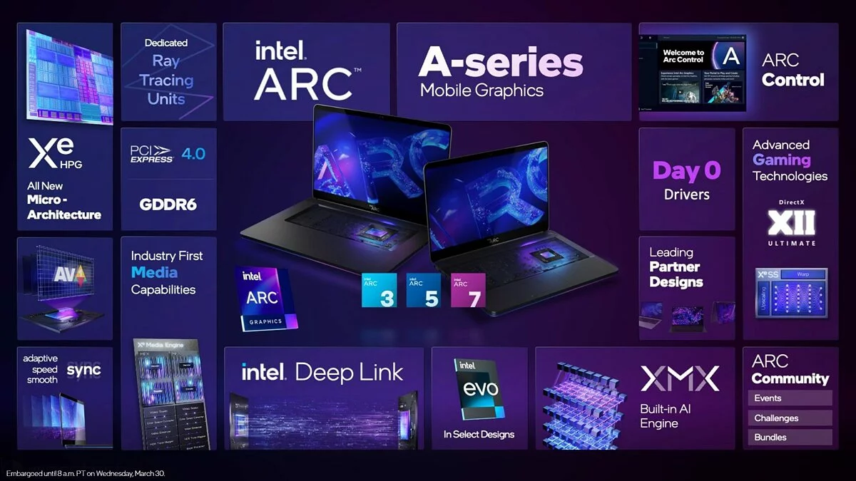 Компания Intel представила свои дискретные мобильные видеокарты Arc Alchemist и рассказала подробные характеристики новинок. В продажу они выйдут в начале лета. Ожидается три линейки, в каждой из которых будет несколько моделей.