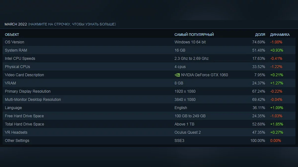 Valve опубликовала мартовскую статистику по оборудованию игроков в Steam: