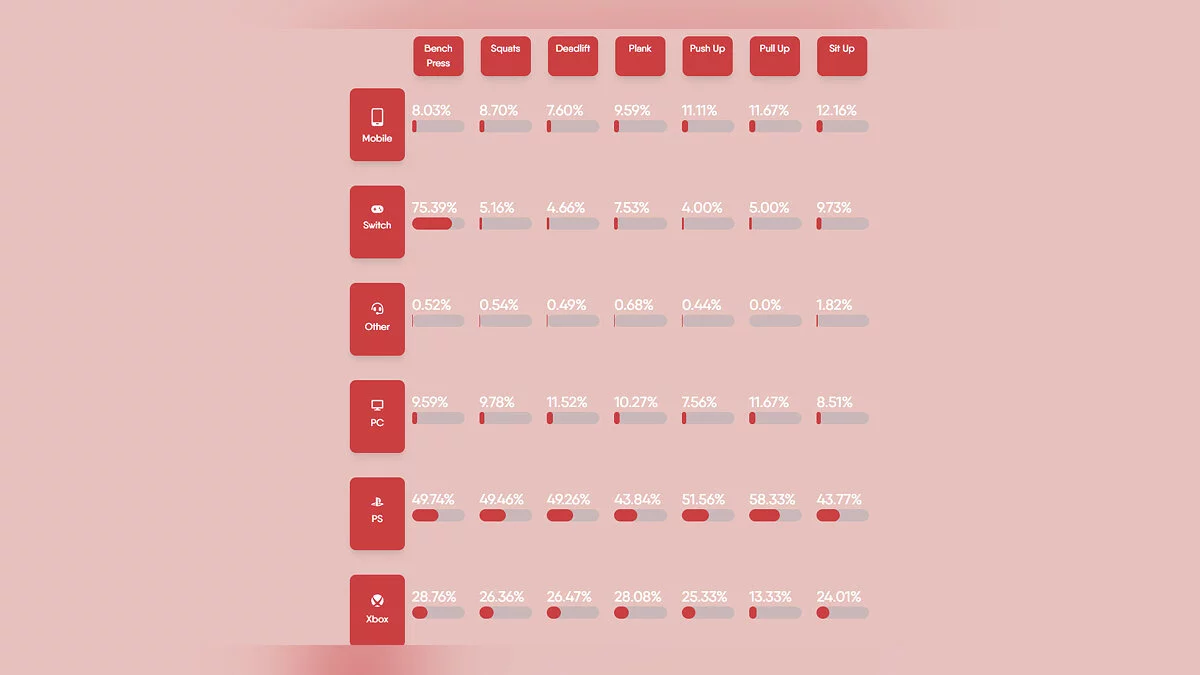 Самые популярные упражнения среди игроков на PlayStation: подтягивания (58,33%), отжимания (51,56%), жим лежа (49,74%) и приседания (49,46%). Среди пользователей Nintendo Switch жим лежа набрал аж 75,39%.