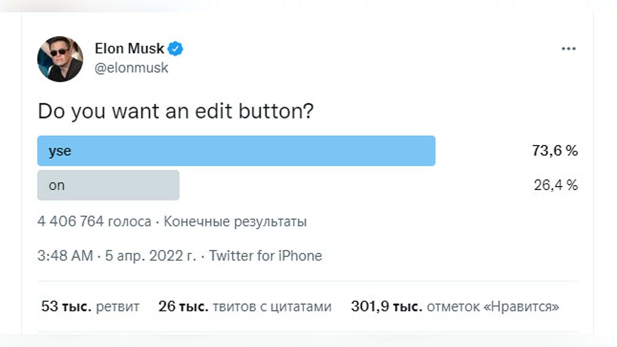 Отметим, что делу, похоже, поспособствовал Илон Маск (Elon Musk), который купил 9,2% акций компании. И почти сразу же после этого он спросил, нужна ли пользователям кнопка редактирования.