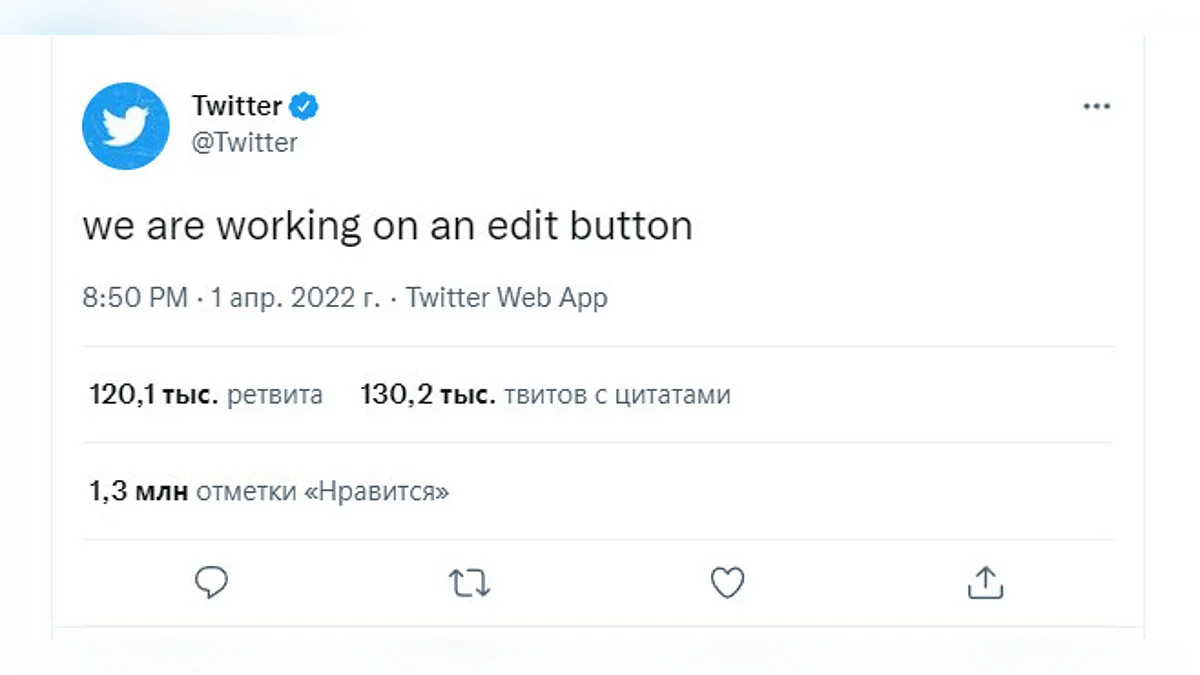 В сети микроблогов Twitter появится кнопка редактирования. Об этом сообщили ещё 1 апреля, но все сочли идею шуткой. Однако уже 6 числа её подтвердили официально.