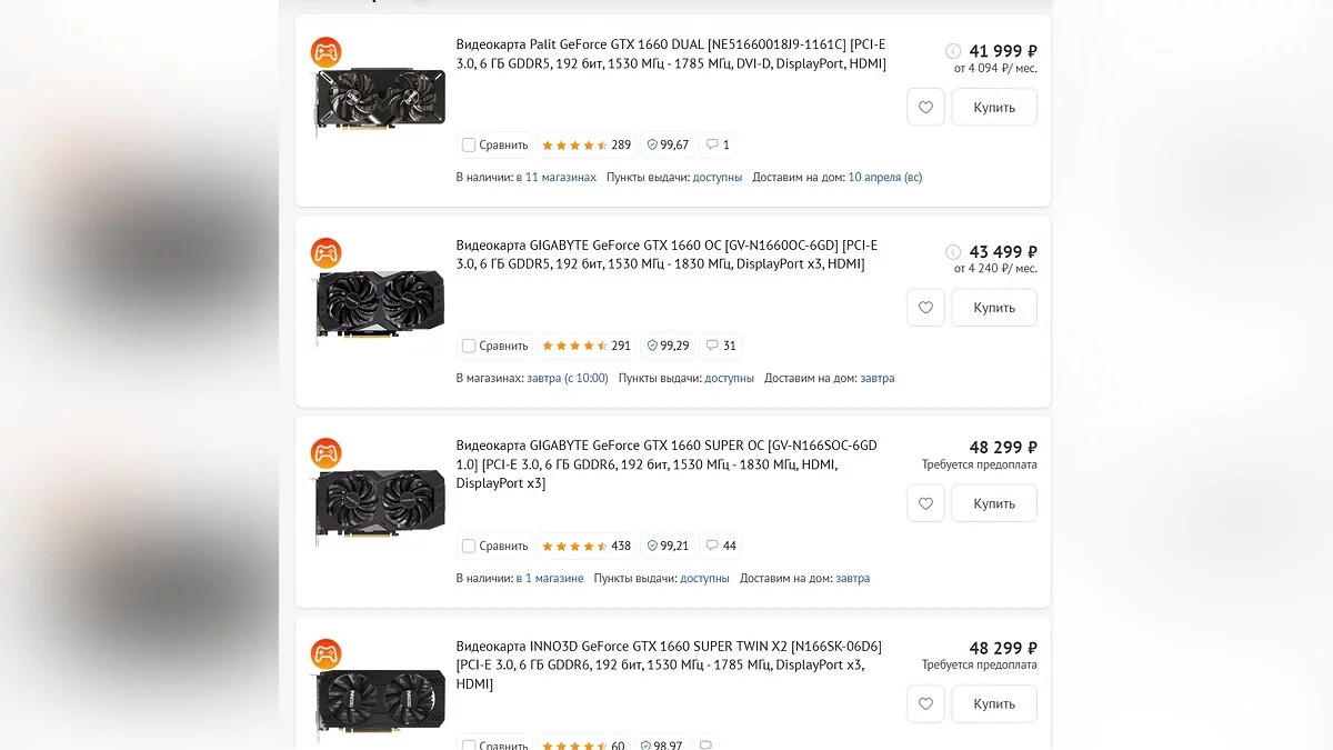По данным магазина DNS, на данный момент цена стартует от 42 тысяч рублей (модель GTX 1660 Dual от Palit). За ней идёт GTX 1660 Ti от Gigabyte примерно за 50 тысяч, а GTX 1660 SUPER от того же производителя оценена в 48 тысяч рублей. Таким образом, цены существенно упали по сравнению с мартовскими.