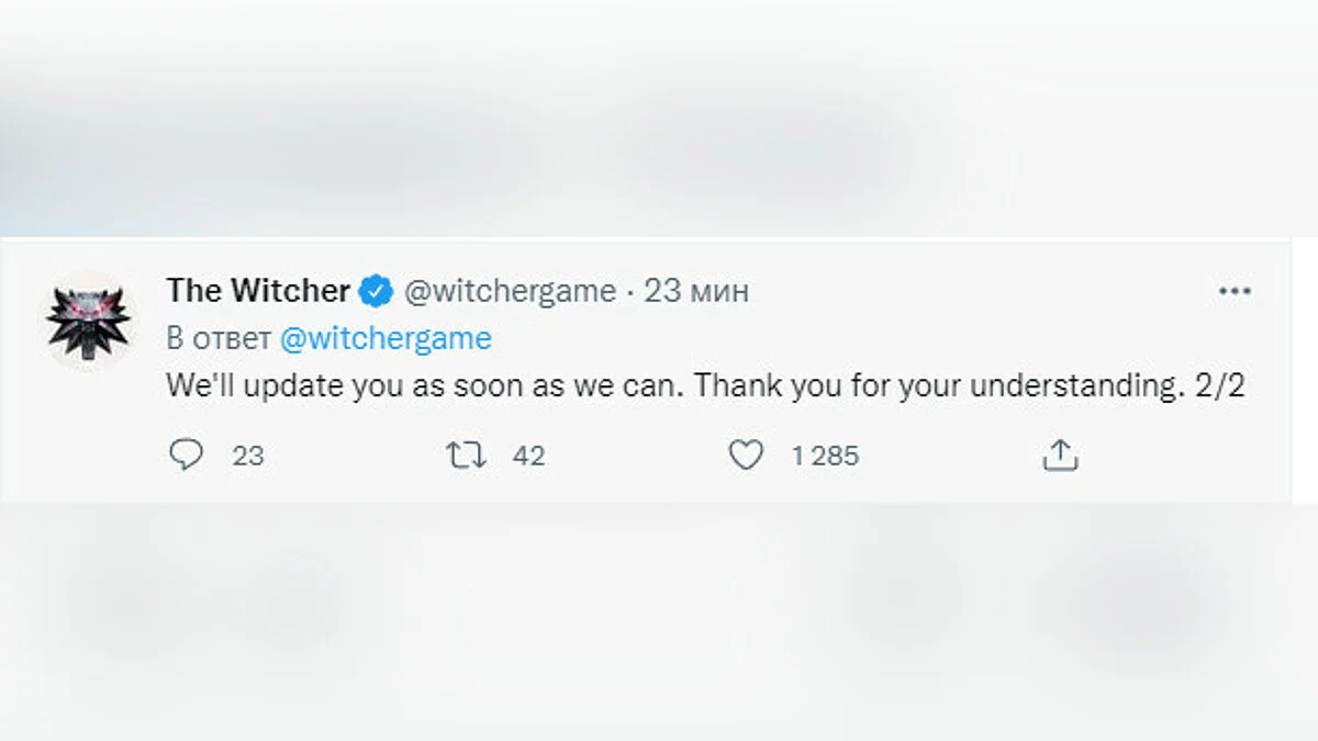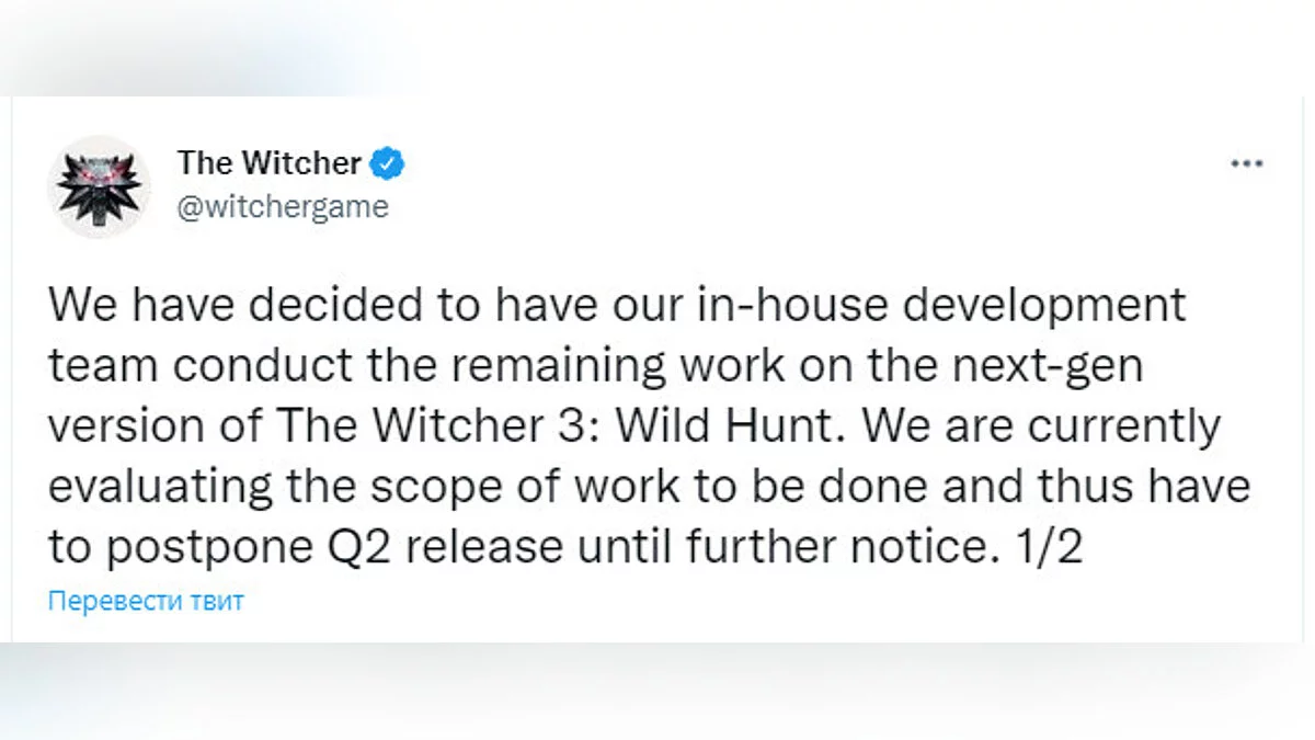 Мы решили, что оставшуюся часть работы над версией The Witcher 3: Wild Hunt следующего поколения проведет наша собственная команда разработчиков. В настоящее время мы оцениваем объем работ, которые необходимо выполнить, и поэтому вынуждены отложить выпуск до дальнейшего уведомления.