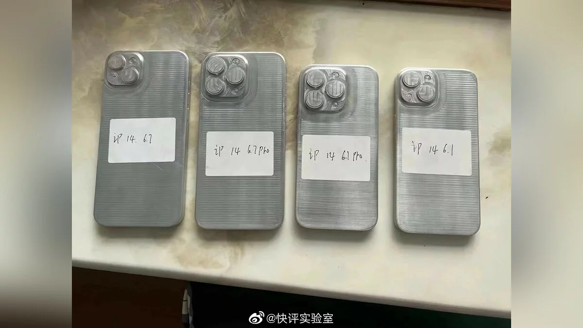 Сетевые источники опубликовали первое живое фото с макетами iPhone 14, iPhone 14 Pro, iPhone 14 Max и iPhone 14 Pro Max. Такие «болванки» используются для создания чехлов, но они же позволяют оценить габариты и расположение камер.