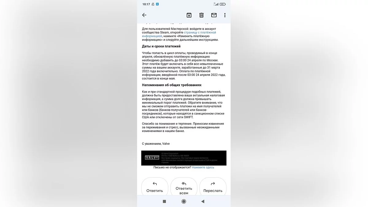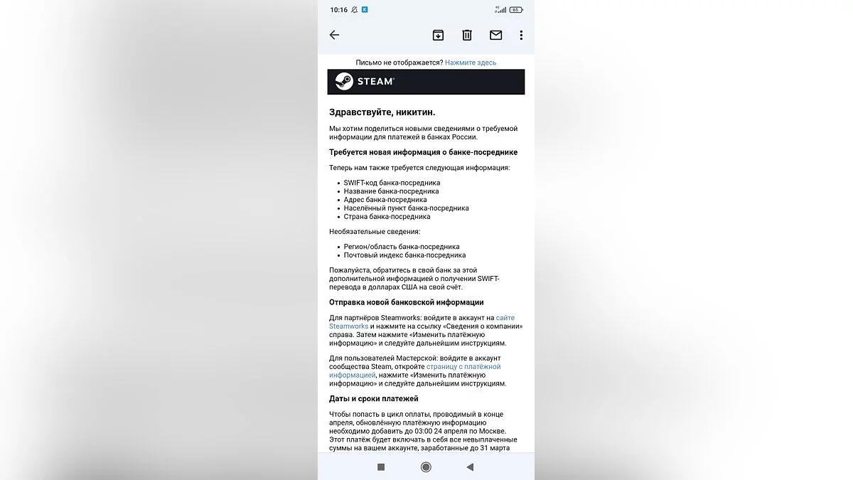 Об этом стало известно из рассылки от администрации Steam. Платформодержатель просит указать SWIFT-код и другие данные банка, куда нужно отправить перевод. Важный нюанс: банк не должен находиться в санкционном списке.