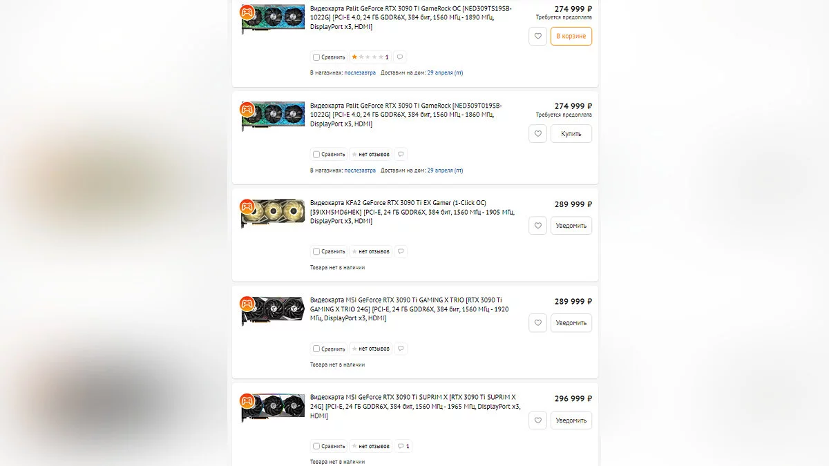 Также на днях появилась информация, что в сети стали доступны видеокарты RTX 3090. Сообщается, что в страну привезли KFA2 GeForce RTX 3090 Ti EX Gamer, MSI GeForce RTX 3090 Ti GAMING X TRIO, MSI GeForce RTX 3090 Ti SUPRIM X, Palit GeForce RTX 3090 Ti GameRock OC и Palit GeForce RTX 3090 Ti GameRock по цене не 300 тысяч рублей. Однако некоторых моделей уже «нет в наличии».