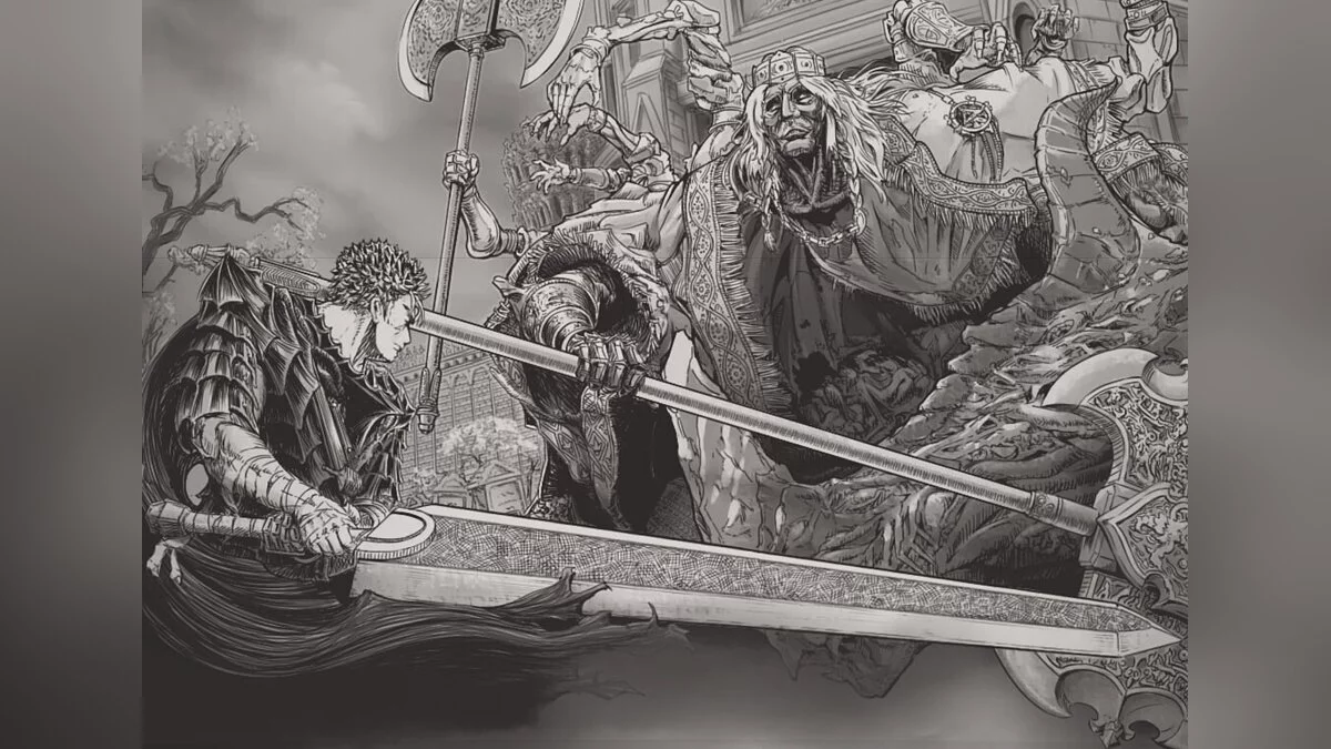 Пользователь Reddit с ником GAISRIK опубликовал арт, на котором показал битву Гатса из «Берсерка» против Годрика из ролевого экшена Elden Ring. Иллюстрация выполнена в виде манги.