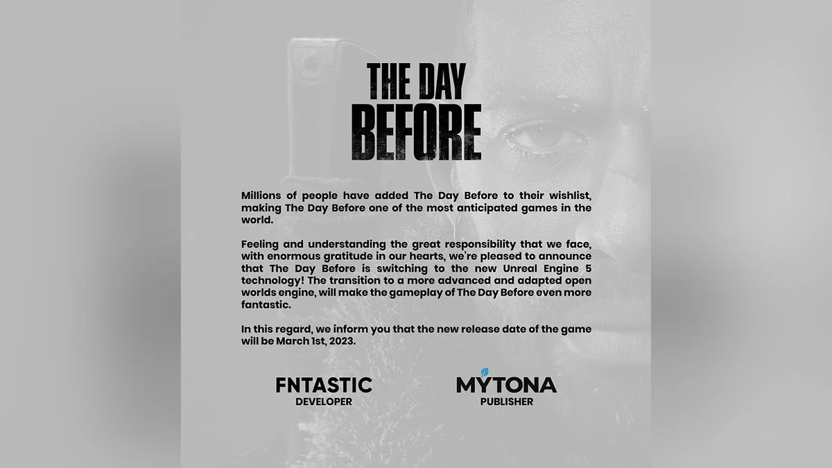 Якутская студия Fntastic сообщила две новости по поводу The Day Before. Хорошая: игра будет работать на базе Unreal Engine 5. Плохая: из-за этого релиз переносится на 1 марта 2023 года.