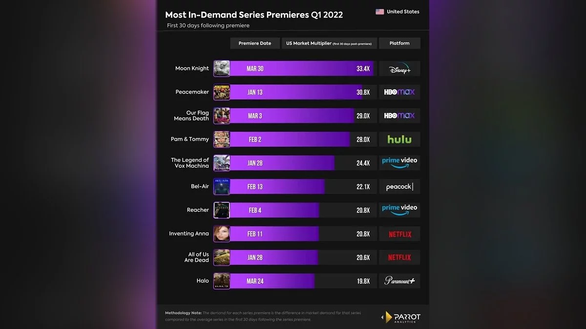 Аналитическая компания Parrot Analytics назвала самые популярные сериалы первого квартала 2022 года в США. В лидеры выбились шоу Marvel и DC.