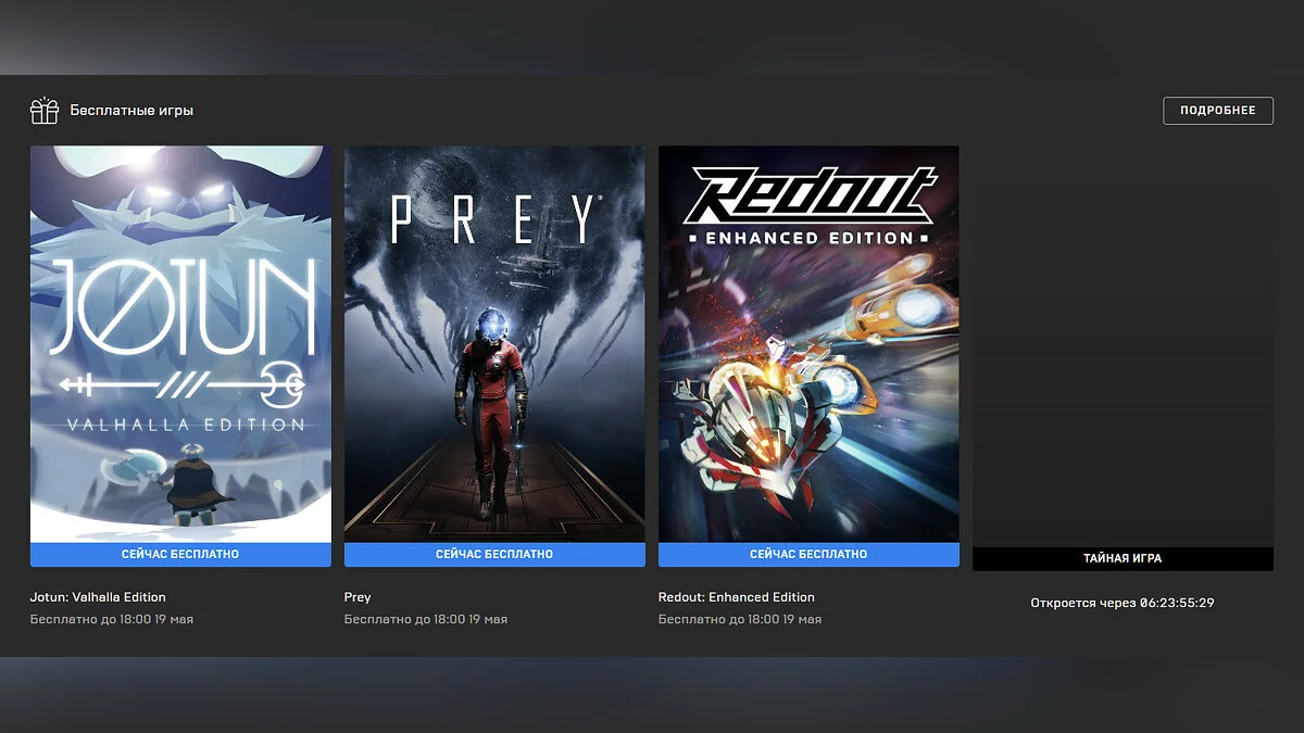 В Epic Games Store стартовала бесплатная раздача трех игр: Jotun: Valhalla Edition, Redout: Enhanced Edition и Prey. Акция продлится до 19 мая 18:00 МСК.