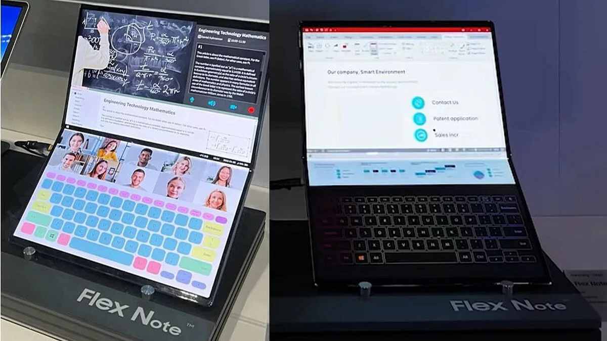 Новинка называется Flex Note и похожа на увеличенную версию складного смартфона Galaxy Z Fold. Устройство работает под управлением Windows, для ввода используется сенсорная клавиатура.