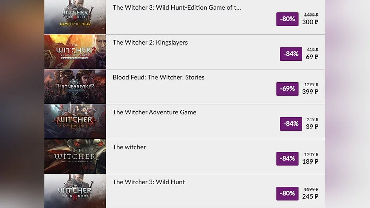 Также в GOG началась распродажа всех основных игры и спин-оффов The Witcher со скидками до 85%. Полное издание третей части отдают за 300 рублей. Первая The Witcher продаётся за 189 рублей, вторая стоит ещё дешевле — 69 рублей.
