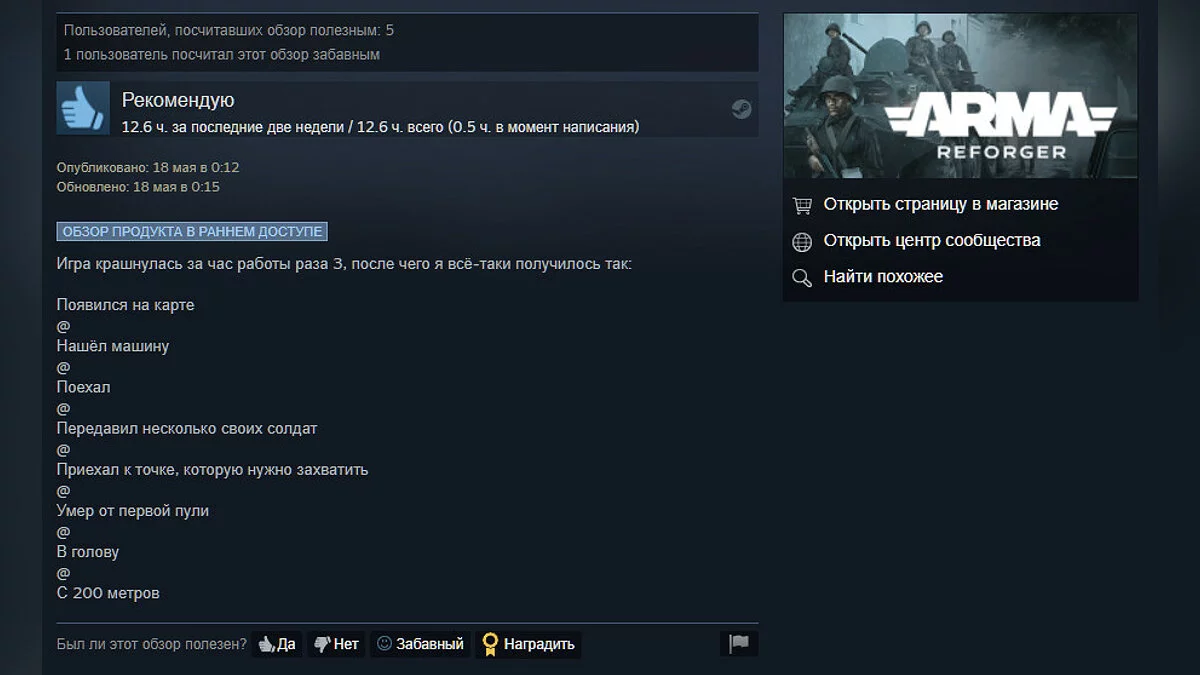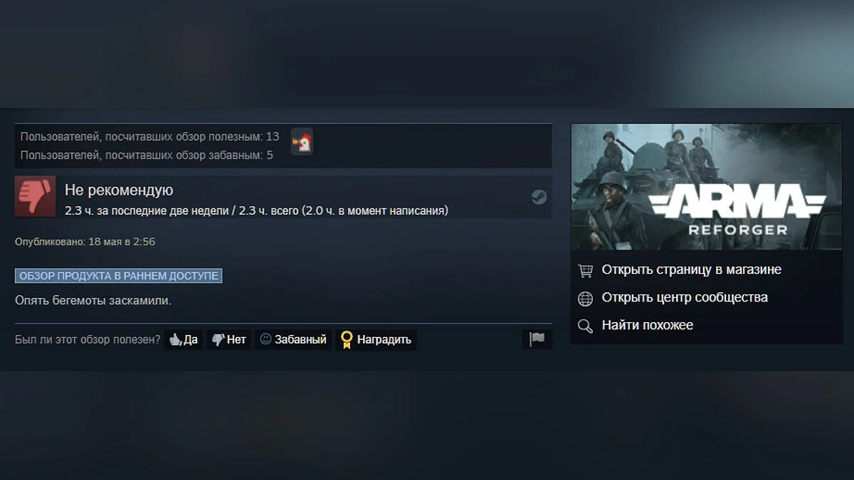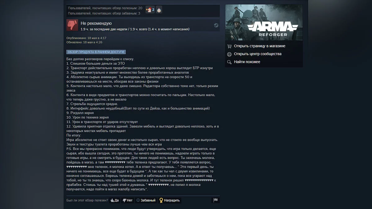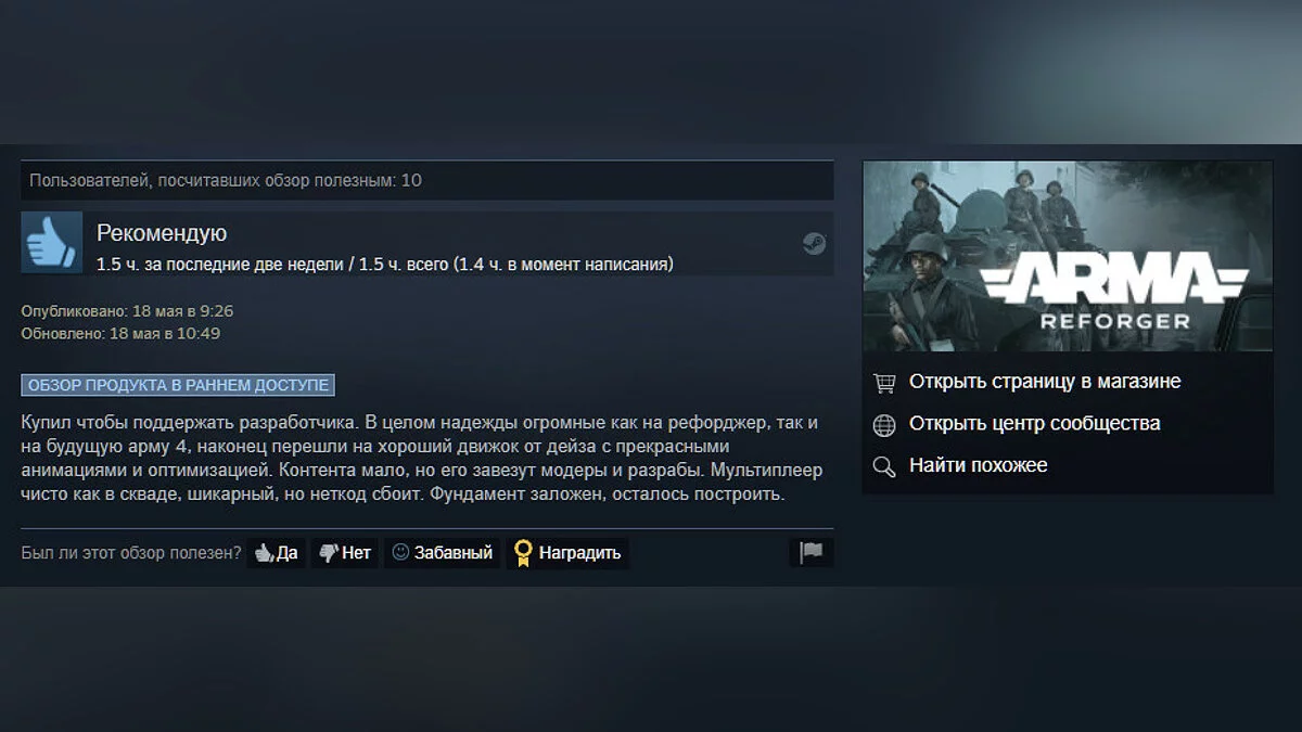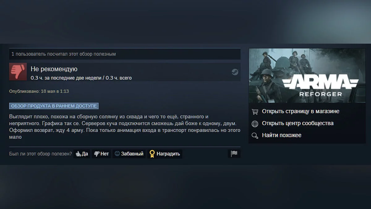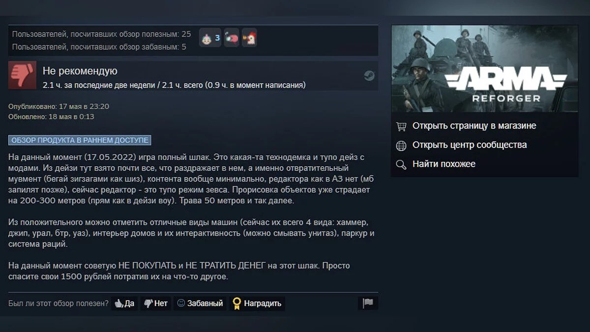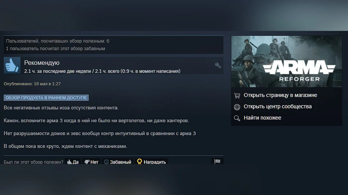 В основном игроки жалуются на сырое состояние игры, сравнивая Reforger с DayZ и Squad. Авторы многих положительных отзывов ставят хорошую оценку авансом и отмечают, что в свое время у Arma 3 были такие же проблемы.