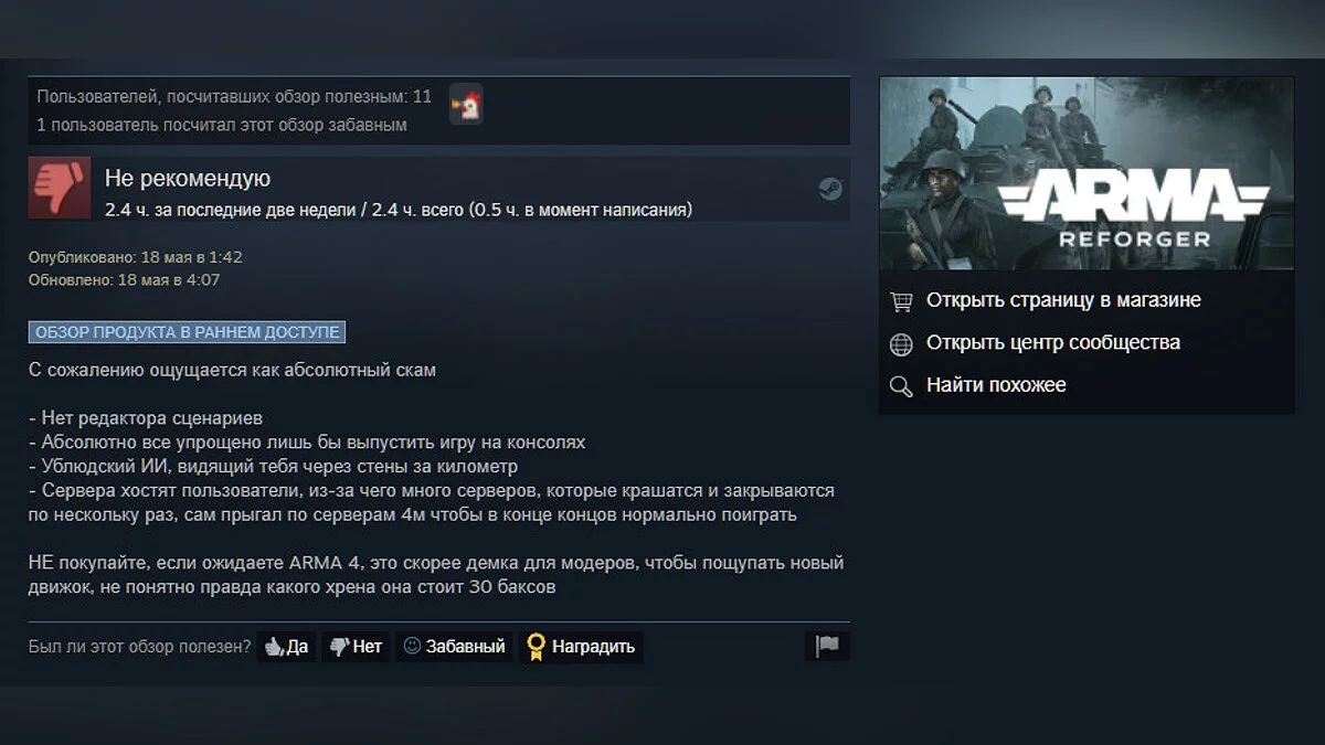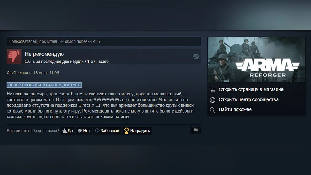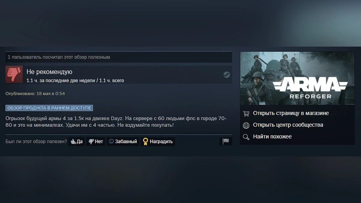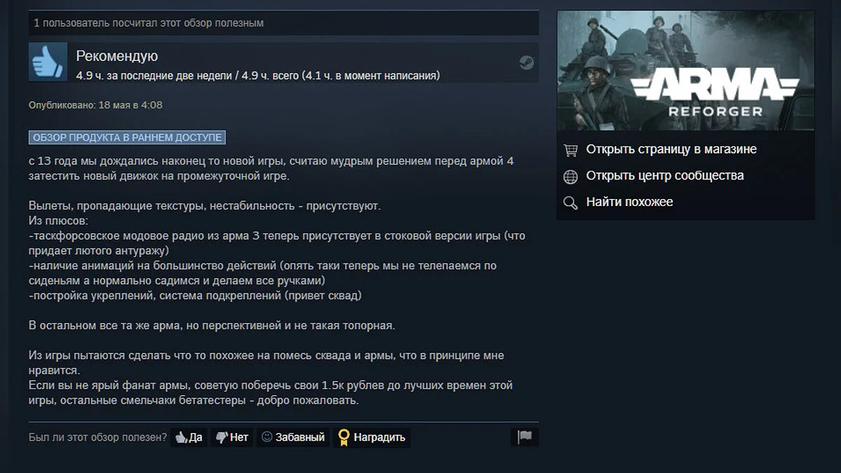 Игра пробудет в раннем доступе около года, поэтому сейчас ее качество оставляет желать лучшего. Пока у Arma Reforger 60% положительных отзывов в Steam.