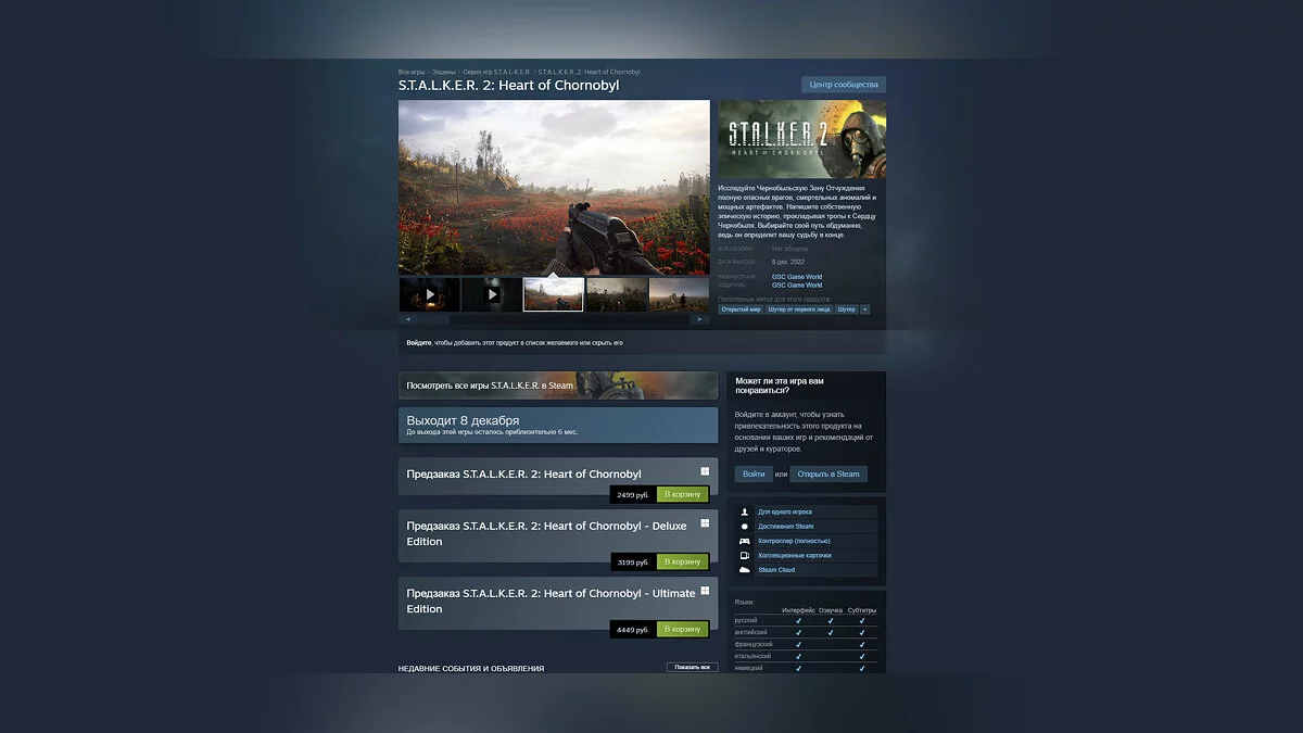 Недавно разработчики заявили о продолжении разработки S.T.A.L.K.E.R. 2. Пока что релиз намечен на 8 декабря 2022 года.
