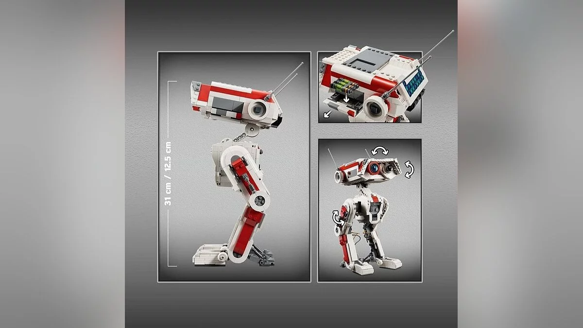 Судя по изображениям, модель состоит из 1062 деталей и имеет рост 31 см. У дроида двигаются линзы и ноги, а в голове есть отсек для стимуляторов.