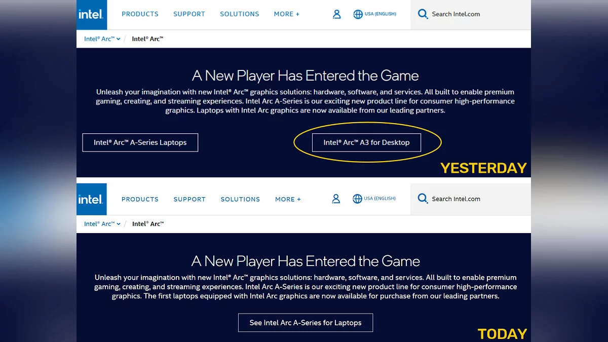 Похоже, компания Intel готовится к скорому выпуску своих десктопных игровых видеокарт Arc. На официальном сайте на короткое время появилась ссылка, касающаяся моделей Arc A3. Хотя она никуда не вела, а затем её и вовсе удалили, но скриншоты успели разойтись по сети.