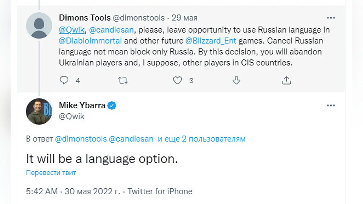 В игре Diablo Immortal останется возможность выбрать русский язык, сообщил в Twitter президент Blizzard Майк Ибарра (Mike Ybarra). Так он ответил на вопрос поклонника, который попросил не удалять русскоязычную локализацию из игры. Ведь, по словам пользователя, это помешает играть не только россиянам, а всем жителям СНГ.