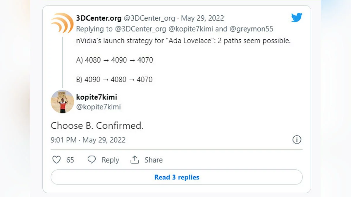 Появилась свежая информация о серии видеокарт NVIDIA RTX 40. Инсайдер Kopite7kimi считает, что они могут дебютировать уже в середине июля, при этом первой появится топовая RTX 4090. А уже следом за ней пойдут RTX 4080 и RTX 4070.