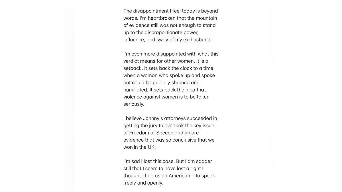 Разочарование, которое я испытываю сегодня, невозможно описать словами. Я убита горем из-за того, что гор улик оказалось недостаточно, чтобы противостоять огромной власти и влиянию моего бывшего мужа. А еще сильнее меня расстраивает то, что это решение может означать для других женщин. Это возвращение к тем временам, когда женщину, которая о чем-то заявляет, можно было публично унизить и опозорить. Я считаю, что адвокатам Джонни удалось заставить присяжных не обращать внимания на ключевой вопрос свободы слова и игнорировать доказательства, которые были настолько убедительными, что мы выиграли в Великобритании. Но еще более грустно мне становится оттого, что я, кажется, потеряла право, принадлежащее любой американке — говорить свободно и открыто.