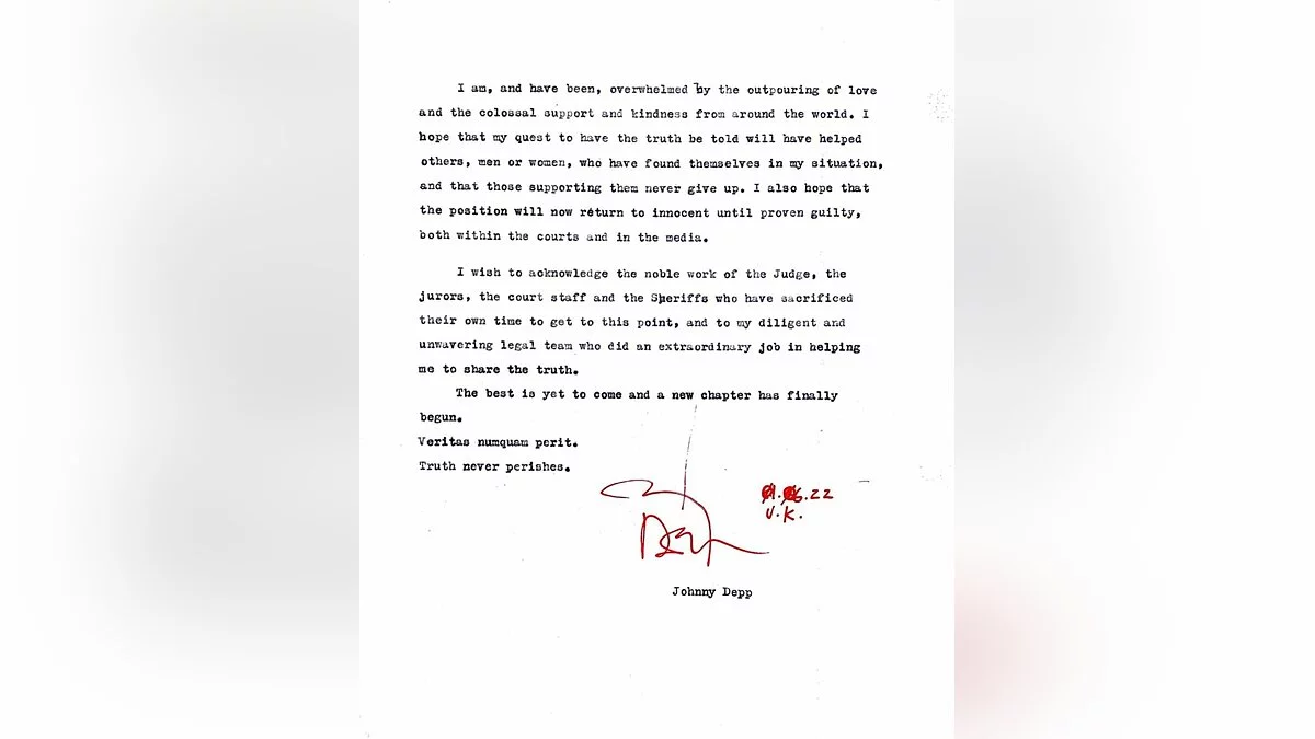 Я хочу выразить признательность судье, присяжным заседателям, сотрудникам суда и шерифам, которые потратили свое время, чтобы добраться до этого момента, а также моей прилежной и непоколебимой юридической команде, которая проделала выдающуюся работу, помогая мне рассказать правду. Лучшее еще впереди, и, наконец, началась новая глава. Истина никогда не погибает. Ваш Джонни.