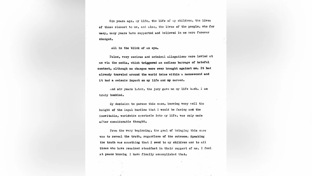 И шесть лет спустя присяжные вернули мне мою жизнь. Я действительно унижен. Мое решение заняться этим делом, прекрасно понимая всю глубину юридических препятствий, с которыми я столкнусь, и неизбежное всемирное зрелище в моей жизни, было принято только после долгих раздумий. С самого начала целью возбуждения этого дела было раскрыть правду, независимо от его исхода. Говорить правду было тем, чем я был обязан своим детям и всем, кто оставался непоколебимым в своей поддержке меня. Я чувствую умиротворение, зная, что наконец-то добился этого.