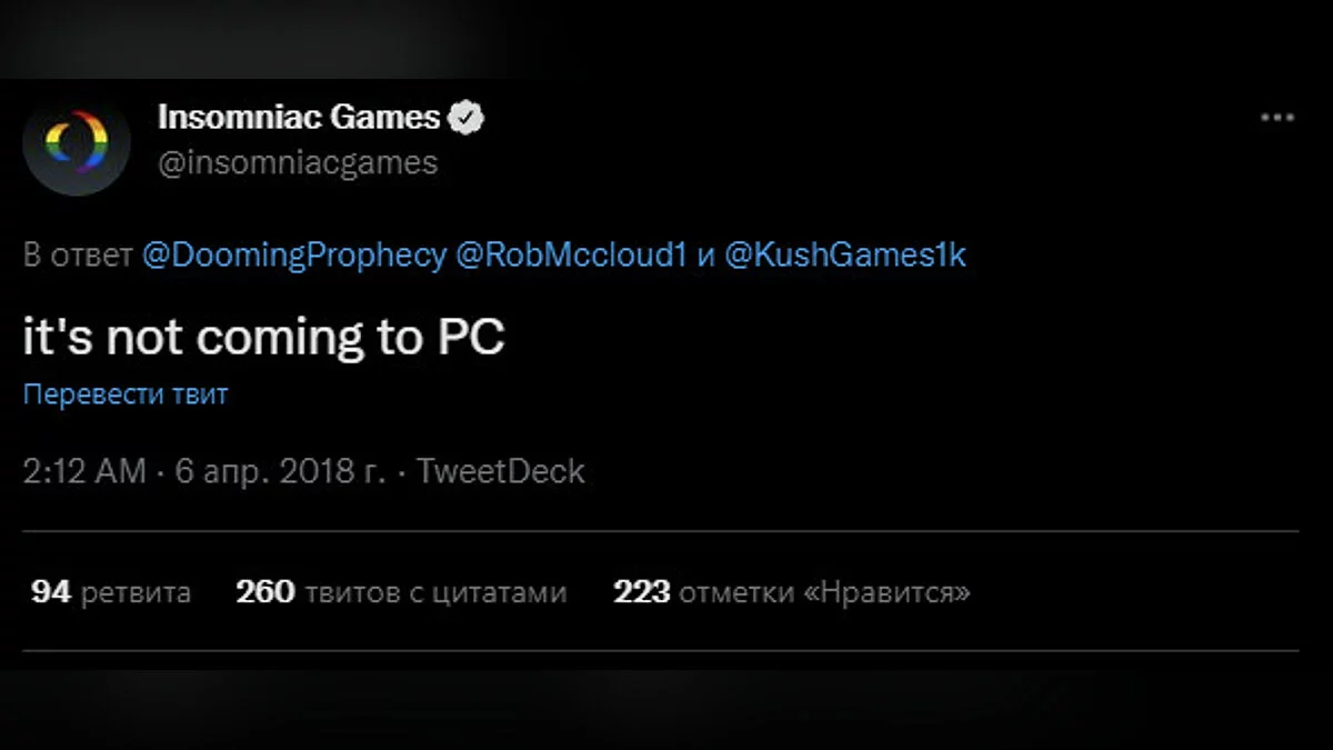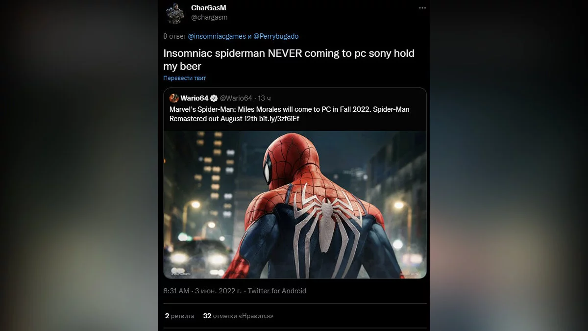 Анонс PC-версии Marvel's Spider-Man и Miles Morales не обошелся без небольшого скандала. Пользователи Twitter припомнили студии Insomniac Games старые твиты, где она обещала не выпускать «Человека-паука» на других платформах.