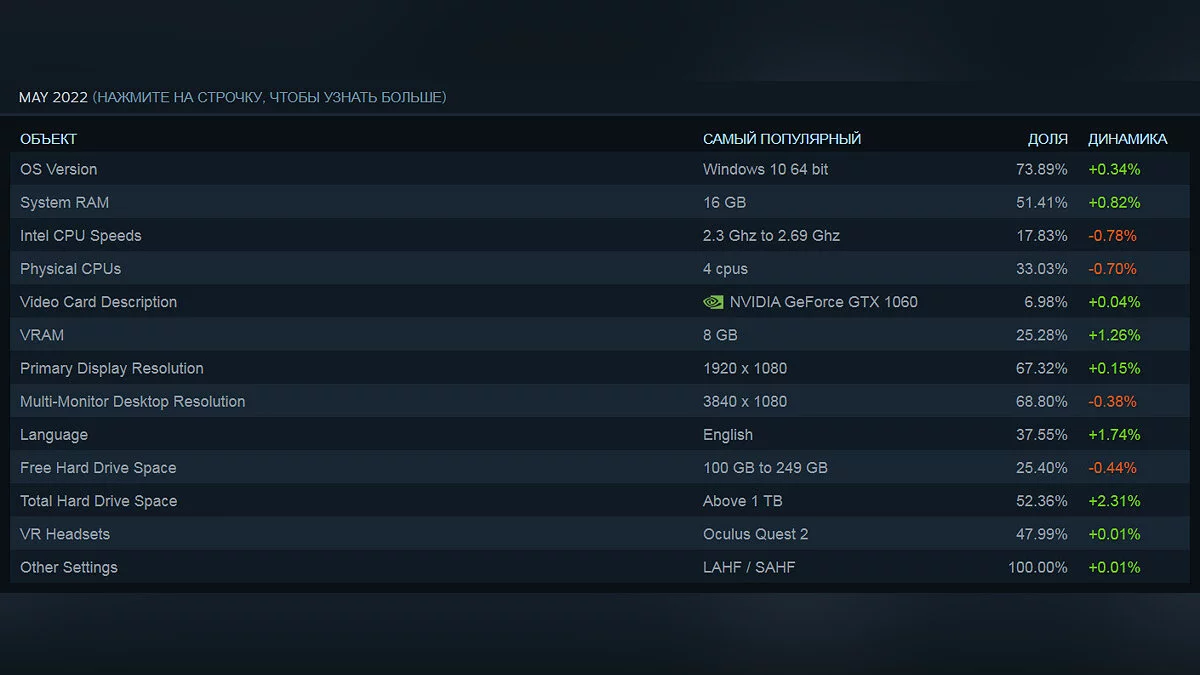 Также большинство игроков в Steam используют 16 ГБ ОЗУ (51.41%), 4-ядерный процессор (33.03%), 8 ГБ видеопамяти (25.28%) и разрешение 1920x1080 (67.32%). Наиболее популярным VR-шлемом остаётся Oculus Quest 2 (47.99%).