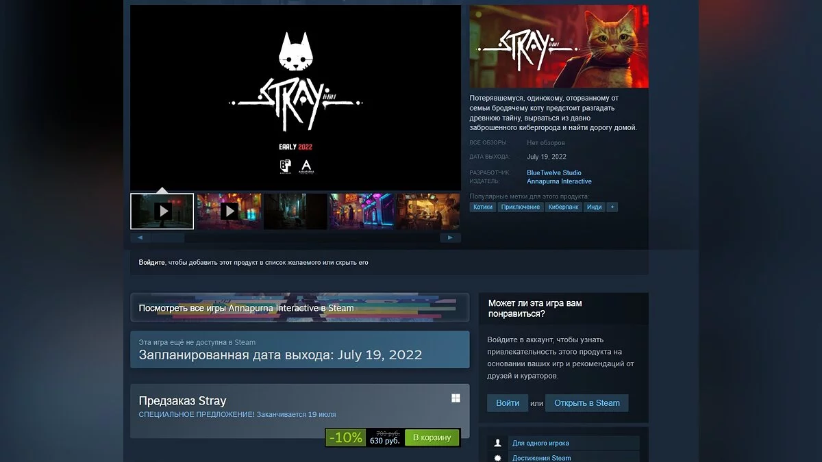 В магазине Steam открылся предзаказ на игру Stray — приключение кота в киберпанковском городе. Примечательно, что её можно предзаказать и в России — за 630 рублей. Как минимум, игру можно положить в корзину.