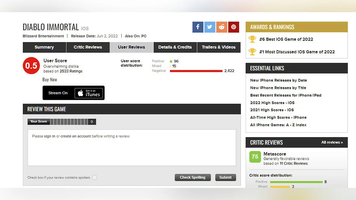 Diablo Immortal поставила своеобразный рекорд на Metacritic, став худшей игрой Blizzard по мнению посетителей сайта. На текущий момент Action/RPG имеет всего 0,5 балла из 10 возможных.