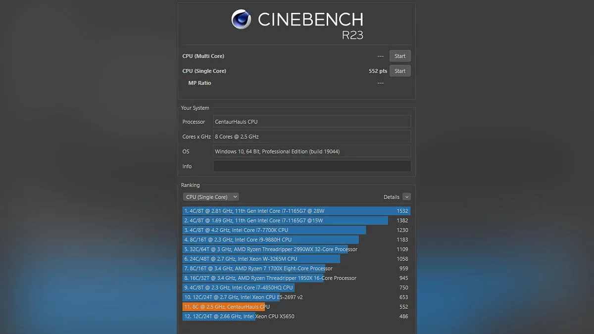Как оказалось, Centaur CHA набирает 552 и 4141 балл в бенчмарке Cinebench R23 (в одно- и многопоточном режимах соответственно). Это примерно уровни двухъядерного G3220T (580 баллов) и четырёхъядерного Xeon E3-1231 (4409 баллов).