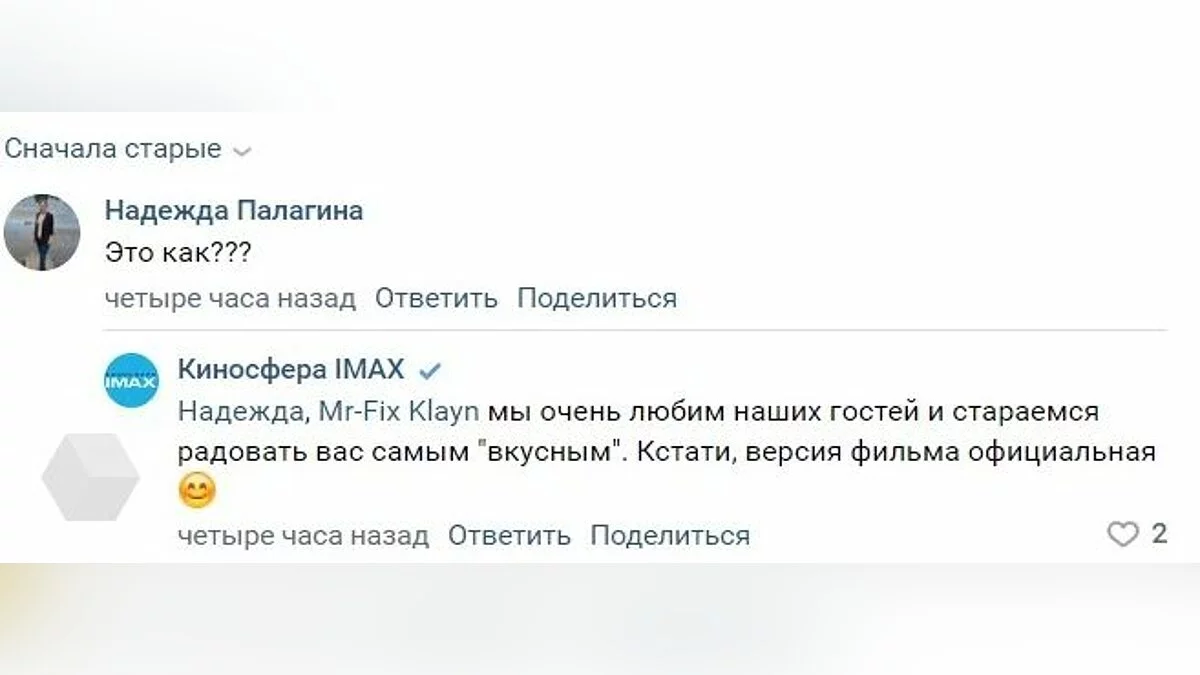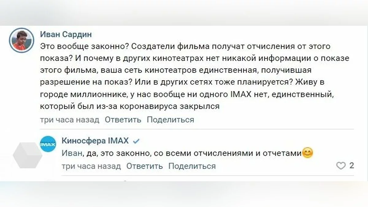 Как отмечают в администрации кинотеатра, это официальная версия фильма «со всеми отчислениями и отчётами». Вероятно, речь идёт о принудительном лицензировании с оплатой на рублёвые счета. Так представители кинотеатра ответили на вопросы пользователей.
