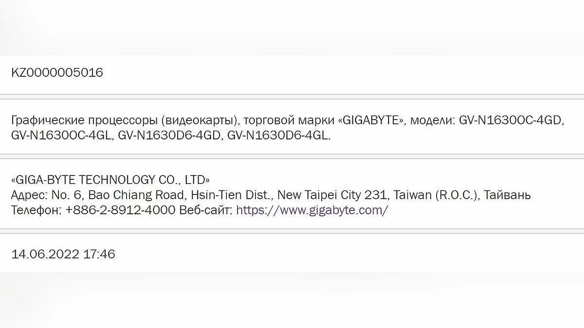 Несмотря на то, что новые бюджетные видеокарты NVIDIA GeForce GTX 1630 отложены, похоже, компании-партнёры готовят их к выходу. Так, в базе данных ЕЭК (Евразийской экономической комиссии) появились сразу три модели GTX 1630 от Gigabyte.