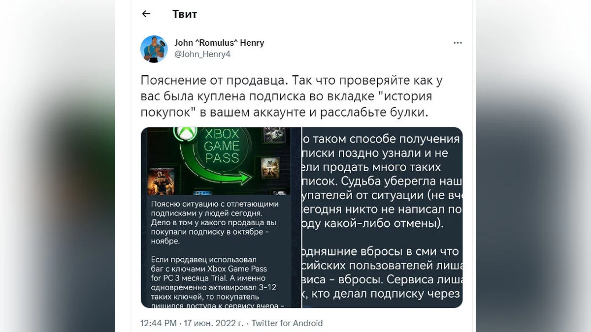 А один из продавцов подписки Game Pass рассказал, что подписки лишились те, кто оформил её через сторонних реселлеров в октябре-ноябре 2021 года. Тогда в системе был баг с ключами на трёхмесячный пробный доступ к Game Pass. Также он уточнил, что проблема касается не только россиян.