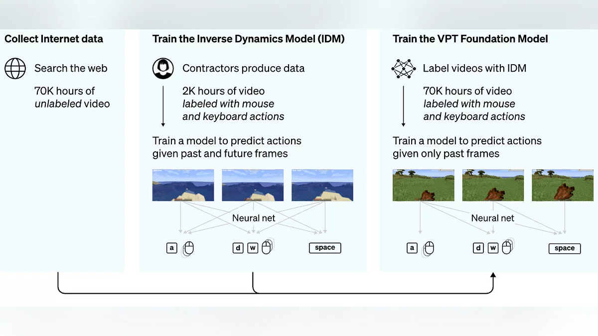 С помощью роликов с геймплеем специалисты из компании Open AI научили искусственный интеллект играть в Minecraft. Нейросети просто показывали видео, в результате она смогла изготовить алмазную кирку, а для этого сначала собрала нужные ресурсы.