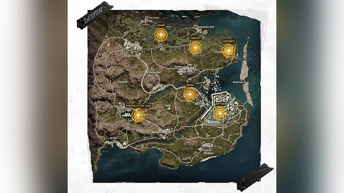 На карте расположено много разнообразных зон: заставленный небоскребами Риптон, пейнтбольная арена, гидроэлектростанция, парк аттракционов и болота. Игроки смогут быстро забираться на крыши высоток при помощи специальных подъемников и спускаться вниз благодаря многоразовым парашютам.
