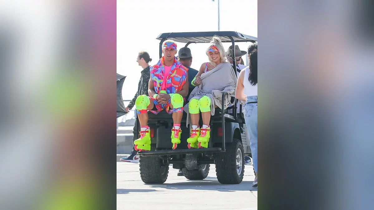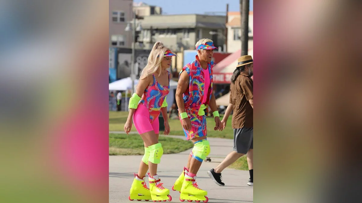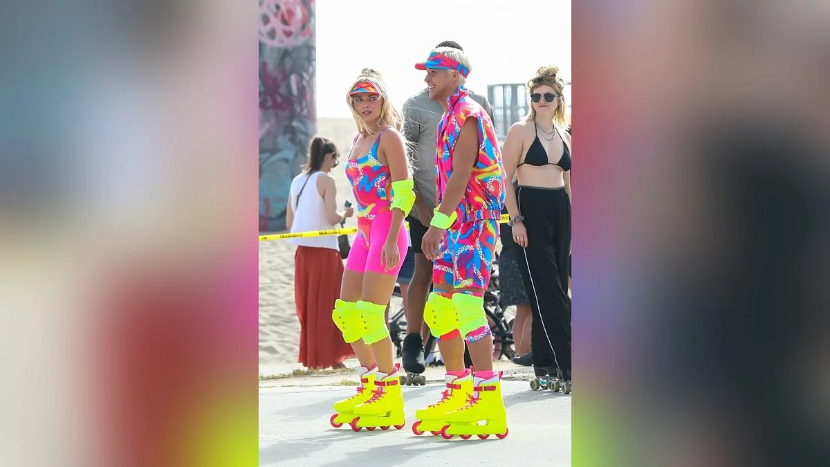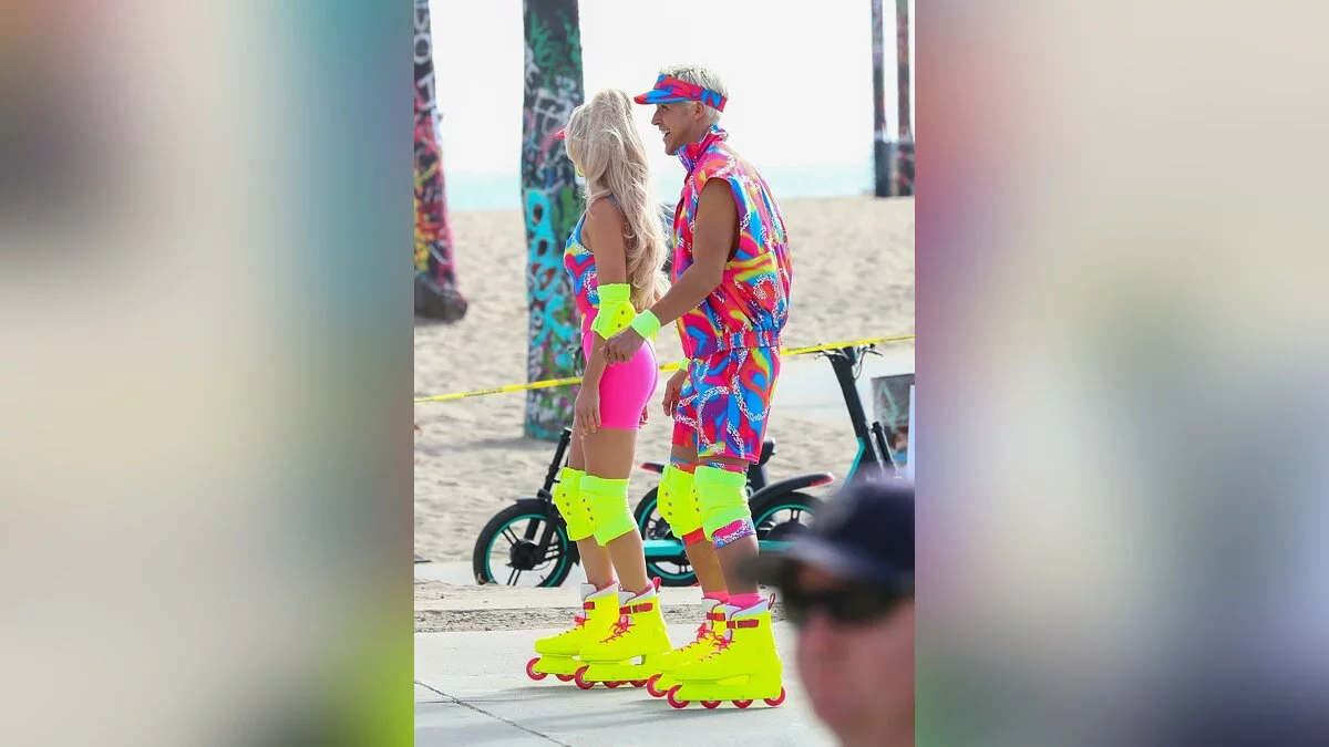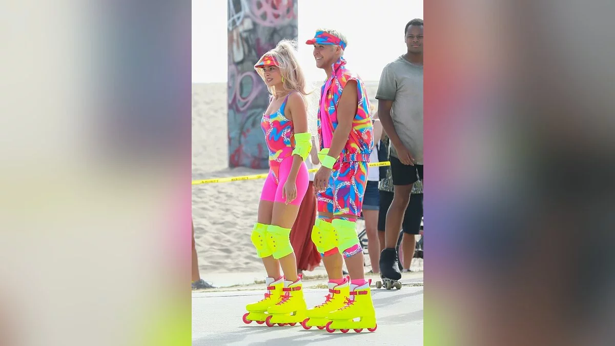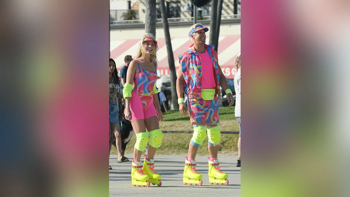 В сети опубликовали очередную порцию фотографий со съёмок фильма «Барби». На свежих кадрах можно увидеть главную героиню и её парня Кена в костюмах из 80-х, решивших прогуляться на роликах по пляжу.