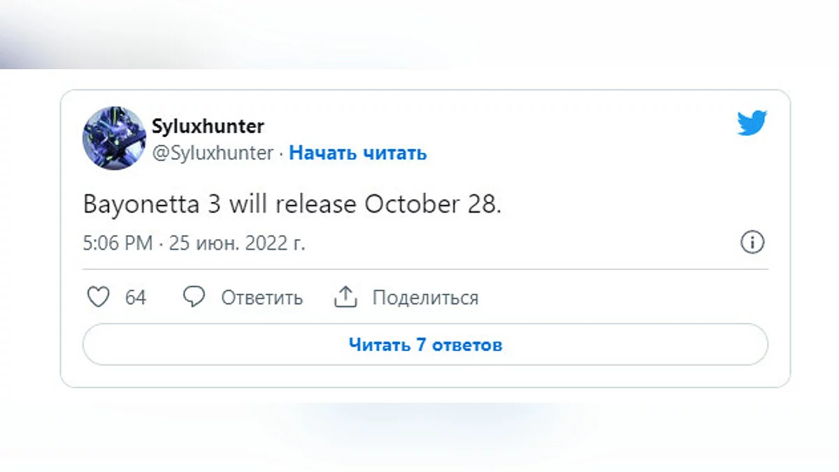 Инсайдер под ником Syluxhunter2 сообщил, что Bayonetta 3 может выйти 28 октября 2022 года на Nintendo Switch.