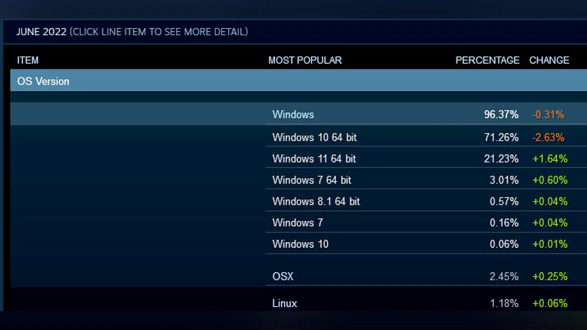 Появилась новая статистика Steam об используемых операционных системах за июнь. И, как оказалось, доля Windows 11 впервые превысила пятую часть от общего числа. На данный момент на новейшую ОС приходится 21,23%.