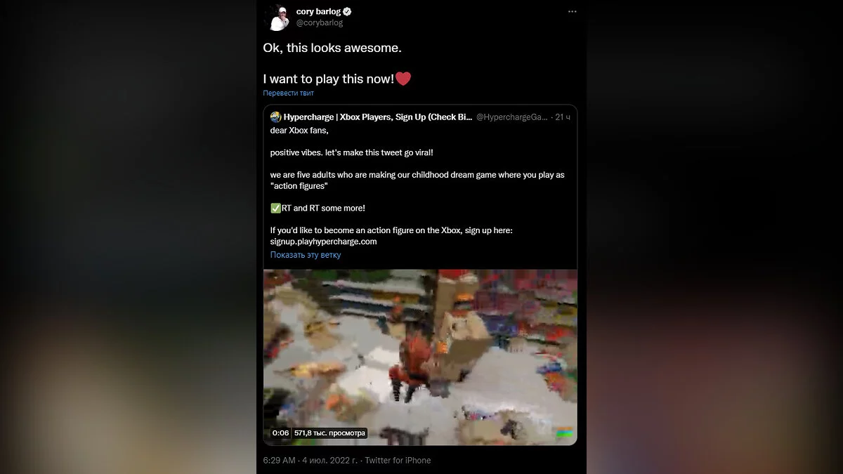 Один из пяти разработчиков игры попросил помощи у других пользователей Twitter, чтобы сделать Hypercharge немного известнее. «Давайте сделаем этот твит вирусным! Мы пятеро взрослых парней, которые делают игру нашей мечты детства, где вы играете за “экшен-фигурки”», — написал автор с предложением ретвитить пост.