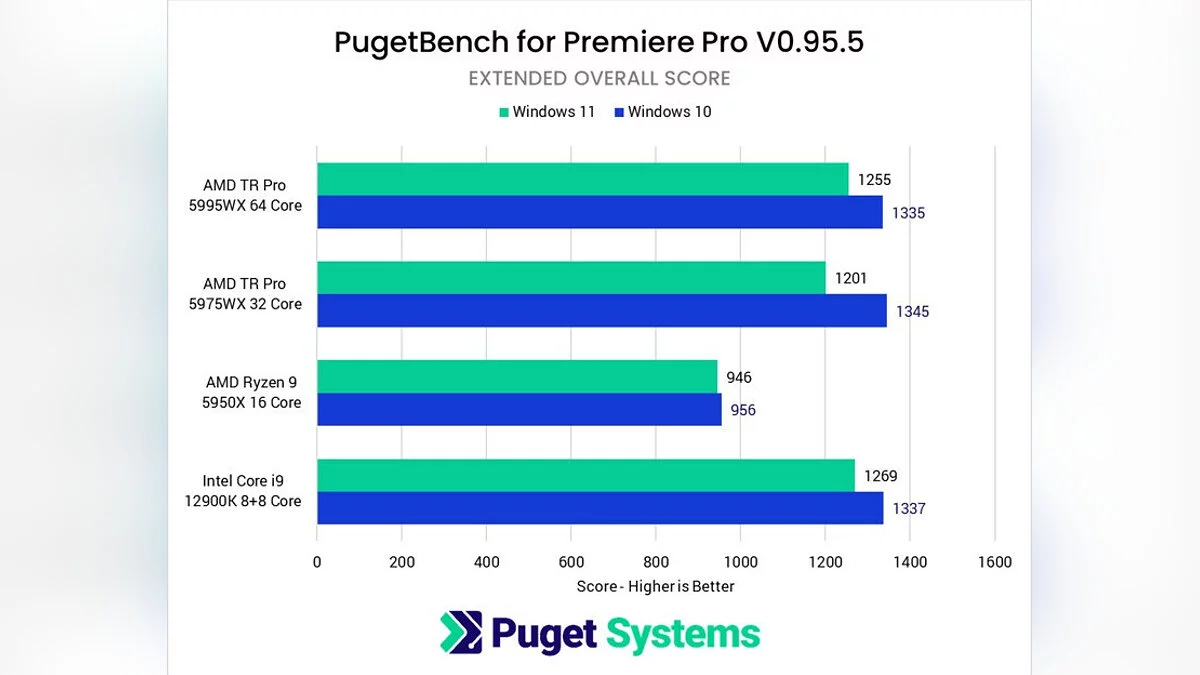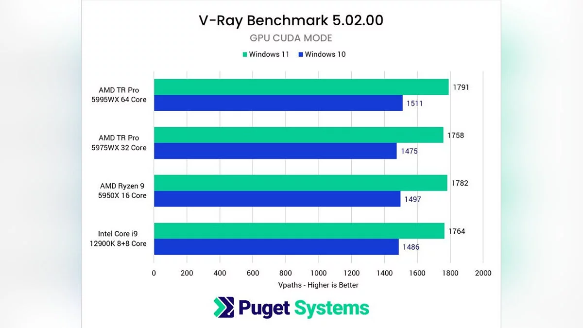 Новинку протестировали на PC с процессорами Intel Core i9-12900K, AMD Ryzen 9 5950X, AMD Threadripper Pro 5975WX и AMD Threadripper Pro 5995WX. И хотя Windows 10 по-прежнему лидирует при работе в Premiere Pro, но в других тестах ситуация для Windows 11 улучшилась. Например, при работе в режиме V-Ray CUDA вперёд вырвалась новая операционная система.
