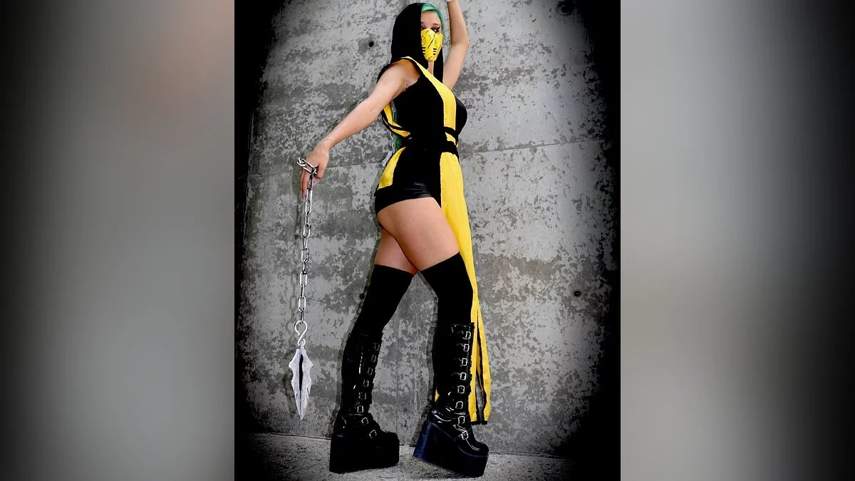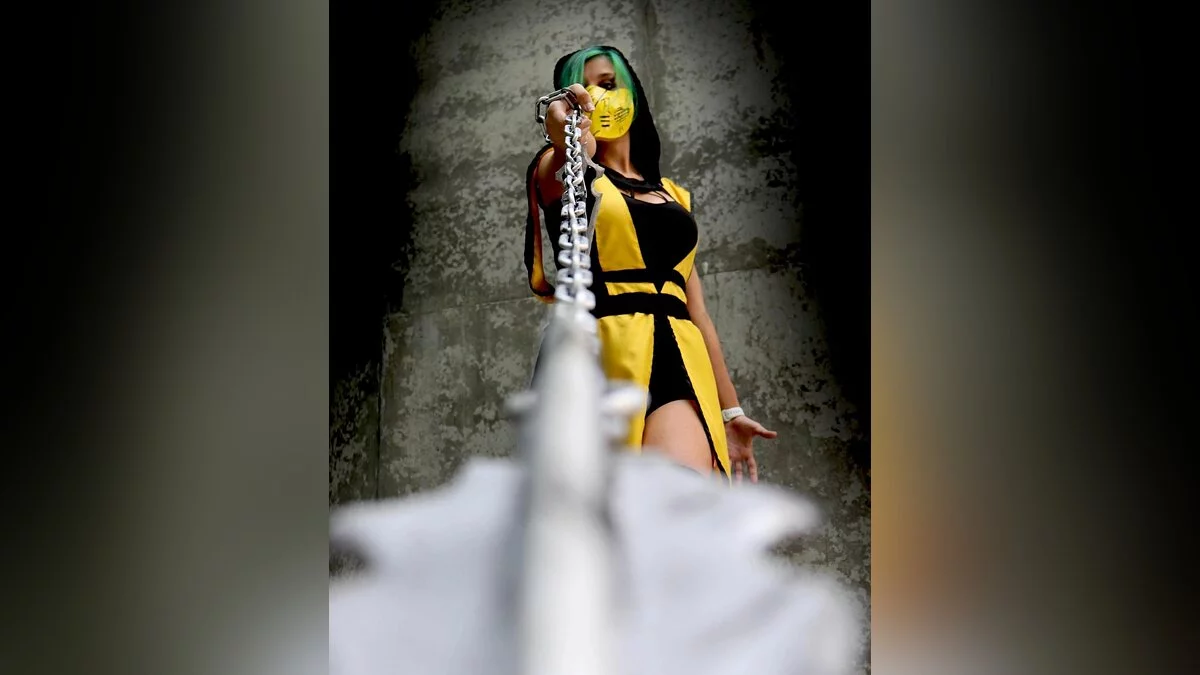 Девушка с красивой фигурой перевоплотилась в Скорпиона из Mortal Kombat. На фото она бросила гарпун прямо в камеру