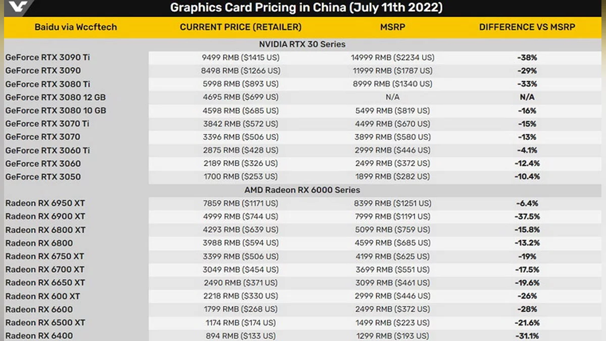 В Китае сильно упала стоимость видеокарт — почти до 40% ниже рекомендемой цены
